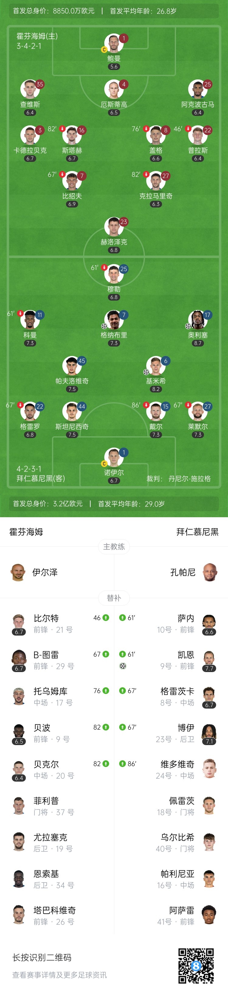 第86分钟,基米希送出挑传,奥利塞回做,博伊得球再捅给凯恩,后者爆射打进死角,拜仁4-0霍芬海姆。↓