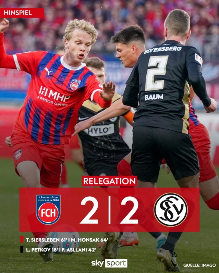 5月23日讯 北京时间2:30,德甲降级附加赛首回合海登海姆vs埃弗斯堡,比赛在福伊特竞技场打响!上半场,阿斯拉尼助攻佩克夫破门,随后自己再下一城完成传射!奥马尔-特劳雷进球被吹。下半场,洪萨克倒钩中横梁!西尔本补射破门;随后洪萨克补射帮助海登海姆扳平比分!最终,海登海姆2-2战平埃弗斯堡,双方次回合将在北京时间27日凌晨进行。
