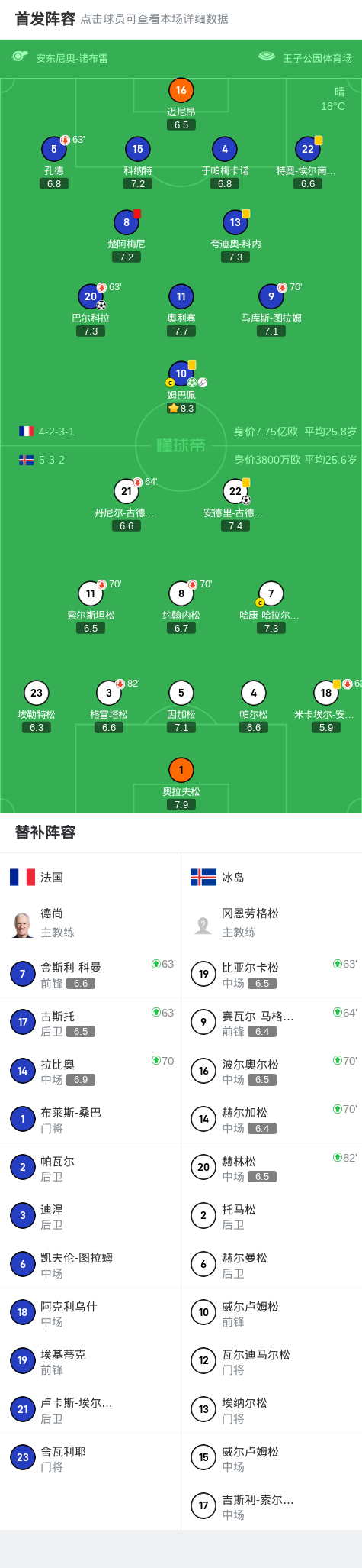 第62分钟,姆巴佩送出助攻,巴尔科拉推射空门,法国2-1冰岛