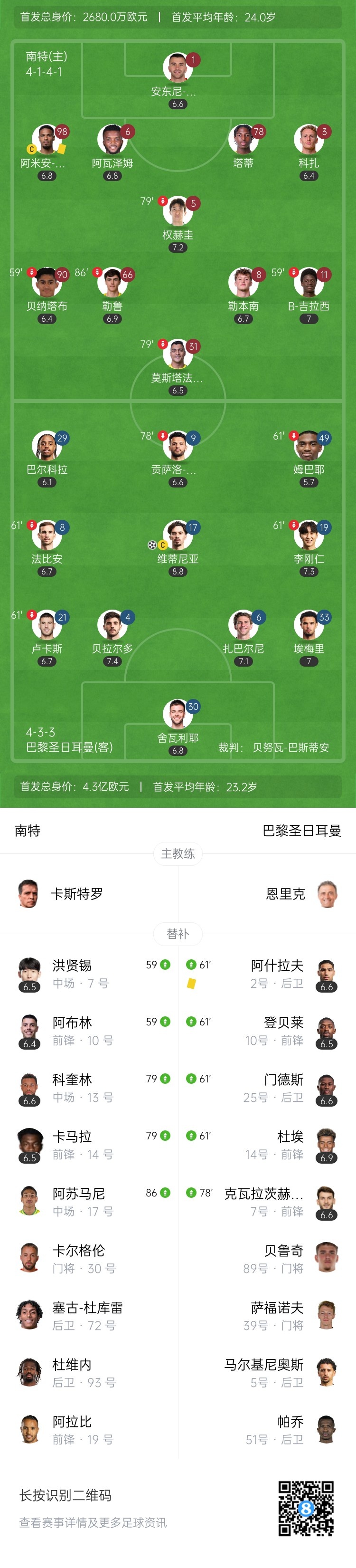 第67分钟,努诺-门德斯左边路分球弧顶,替补登场的维蒂尼亚起脚远射!皮球变线后飞进球门!巴黎1-0领先南特↓