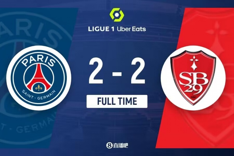下半场伤停补时4分钟,全场比赛结束,最终巴黎圣日尔曼2-2布雷斯特。