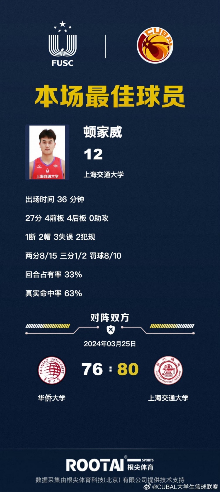 上海交大:顿家威27分8篮板、陈天灿16分6篮板、吴泽昊14分6篮板、刘冠男8分6篮板、胡汇7分7篮板、冯祥硕3分、姜宸轩4分、马锦涛1分。