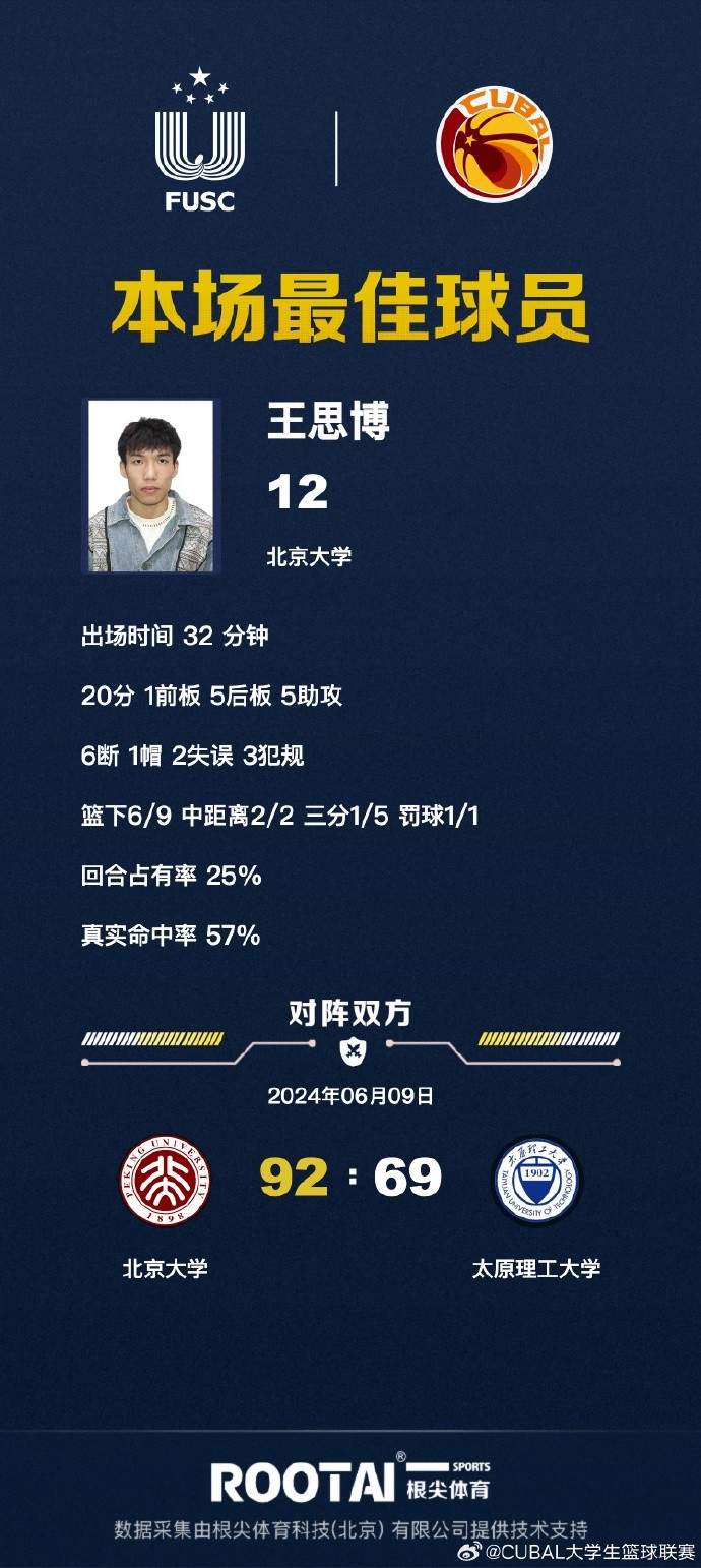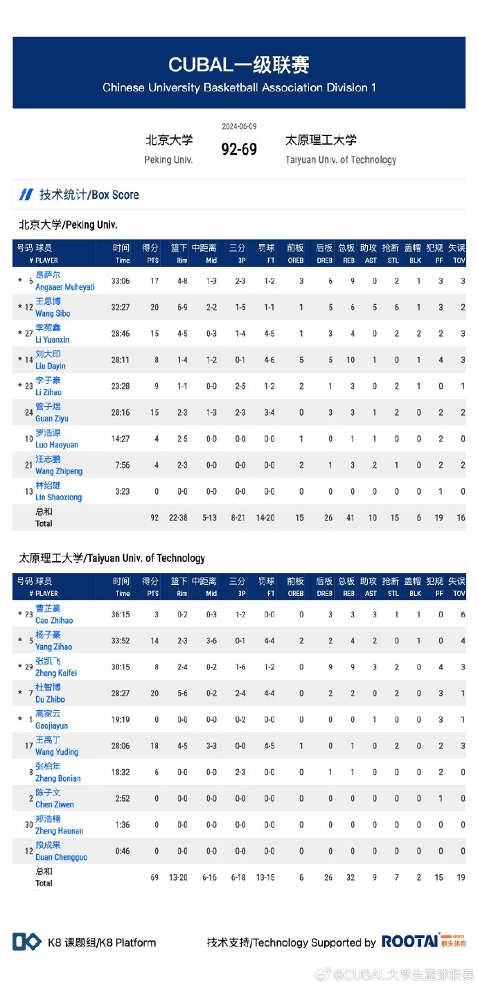 北京大学:王思博20分6篮板5助攻6抢断、刘大印9分10篮板、李子豪9分3篮板、李苑鑫15分4篮板、昂萨尔17分9篮板、管子煜15分