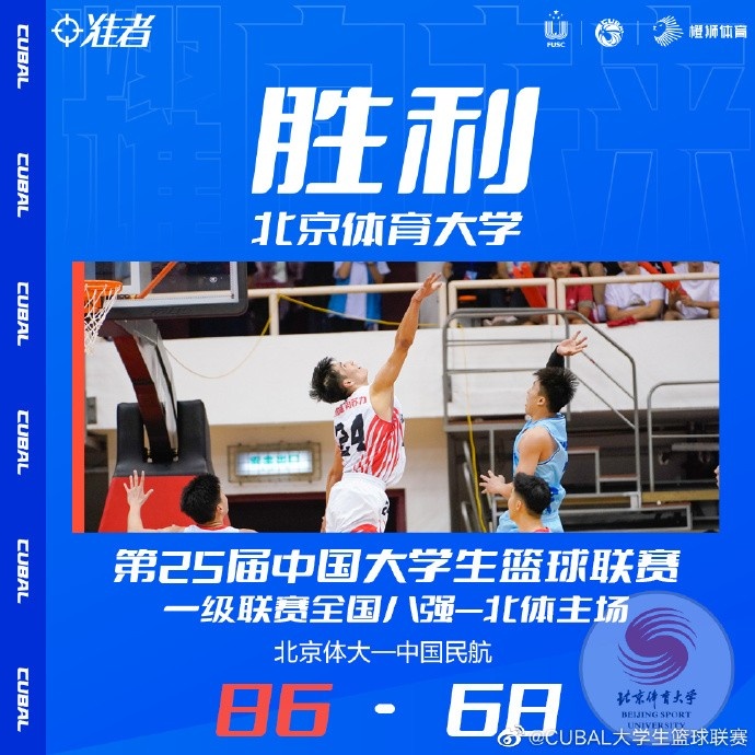 5月27日讯 CUBAL全国八强赛正式打响,首场比赛北京体大主场对战中国民航,两队在东北赛区两次对战各有胜负:小组赛中国民航7分胜北京体大,淘汰赛北京体大以7分成功复仇将民航逼入附加赛。