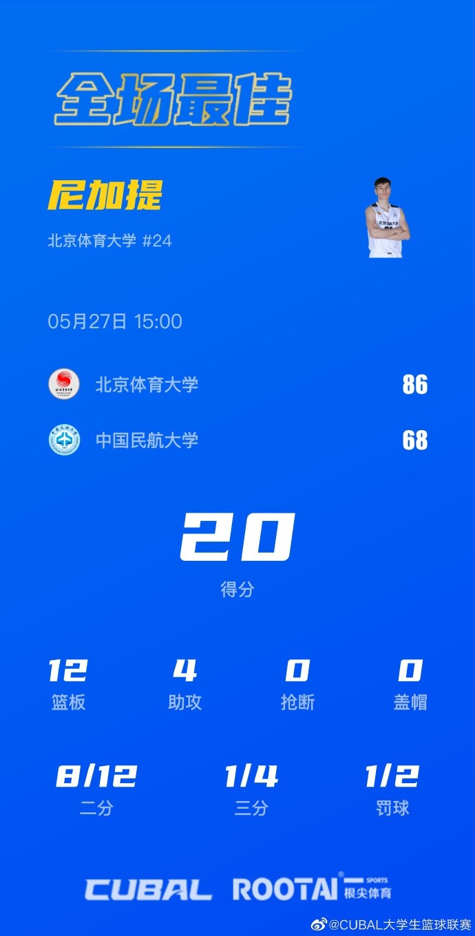 北体大:杨腾飞24分6篮板,尼加提20分12篮板3助攻,谢智杰12分7篮板4助攻5抢断,潘睿彦9分2篮板,鲁骜12分3篮板,祖力布哈儿9分6篮板