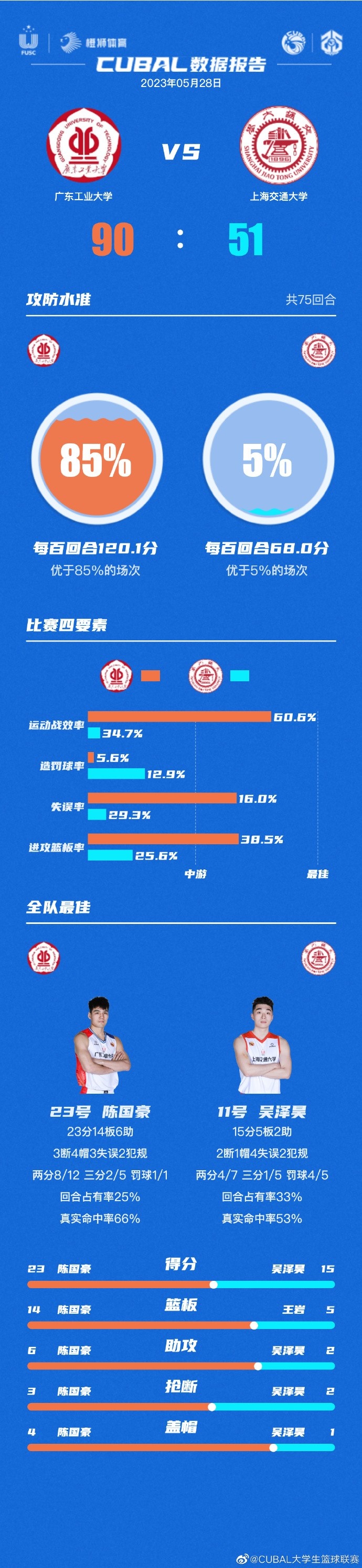 5月28日讯 CUBAL全国八强赛第二日比赛打响,广东工业大学坐镇主场迎战上海交通大学。根据CUBAL赛制规定,进入八强的对阵队伍之间要经过两轮主客场比赛,决出最终巅峰四强。