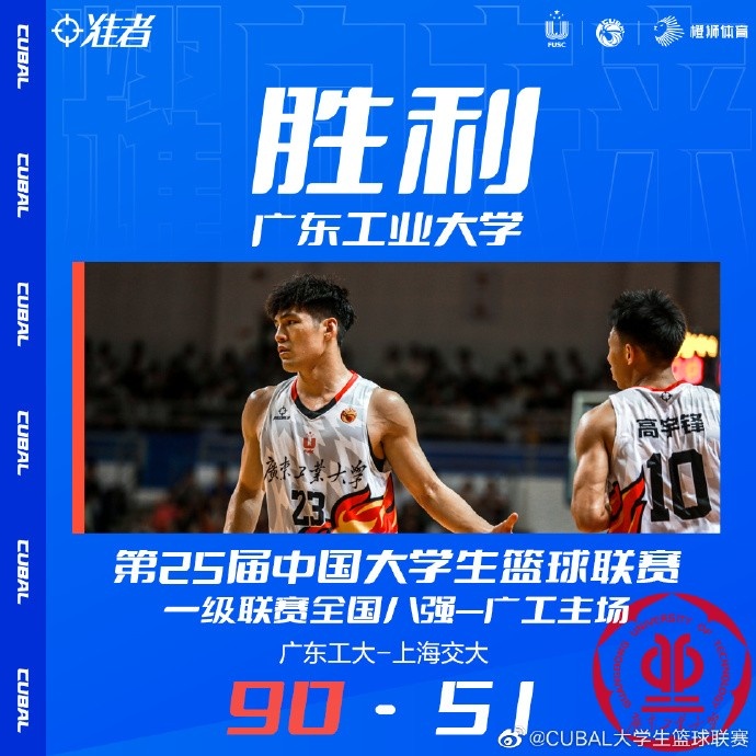 末节回到场上,上海交大连续冲击篮下紧咬比分,但广工进攻端状态还在延续,邵炜昀三分再次命中,全队在对方篮下也是予取予求,双方围绕着35分的分差展开拉锯战,高宇峰篮下上进让分差来到40分,不过吴泽昊外线也能给予回应。最终广工90-51大胜上海交大,先下一城。