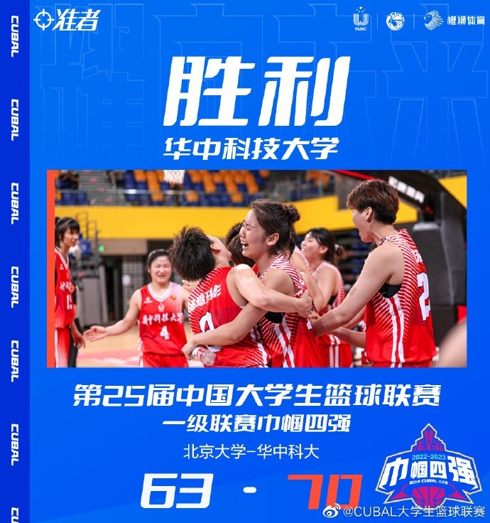 加时赛,刘贝三分上来就进,陈玉婕上篮也能锦上添花,而北京大学进攻端则是比较乏力仅靠王梓伊罚球拿到1分,霍俊彤和杨谭玥影接连上篮命中杀死比赛,最终华中科大加时70-63战胜北京大学,晋级决赛!