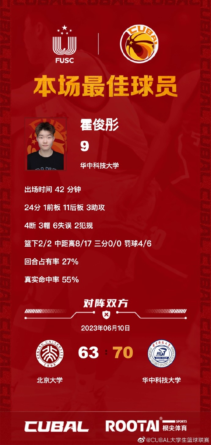 华中科大:霍俊彤24分12板3助4断3帽、刘贝14分9板8助4断、陈玉婕11分8板4助3断、高建军2分11板