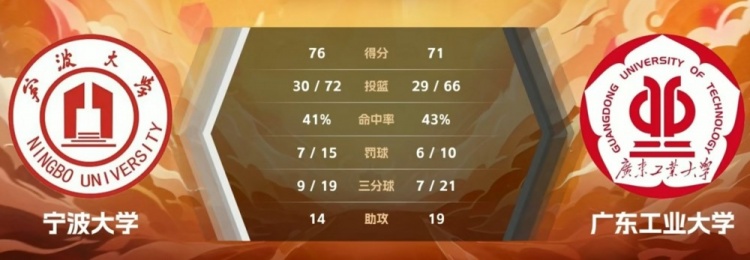 宁波大学:林炜杰18分12板,章海波16分4板3助,王立栋11分,季雨乐10分,洪子豪12分,孙文卓7分5板