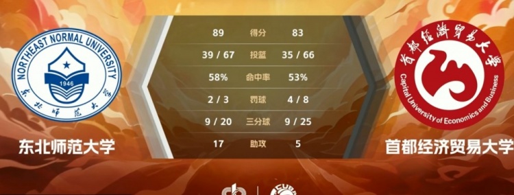 末节决战,薛锴再次成为奇兵,连续进攻篮板后自己补篮打中连砍6分,朱睿泽三分被犯规后邓文捷再打成给出回应,双方比分持续胶着。杨涛硕中投再进,王玖豪三分反超比分,陶阿萨尔三分迅速回应反超回来,比赛逐渐白热化。罗俊翔抢断反击上篮后再突破打成,王玖豪也连续抢断一攻一传,东北师大10-0领先到9分,最终东北师大89-83力克首都经贸,拿到第9名。