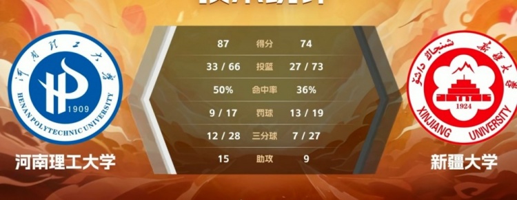 比赛开始,新疆大学率先发力打出9-2的开局,河南理工奋力反击打出7-0扳平比分,马浩楠三分穿针,冯宇坤外线开火迅速回应,马浩楠内外开花连续拿分率队重夺优势,廉岳琪三分也有,首节结束新疆大学25-19领先河南理工。