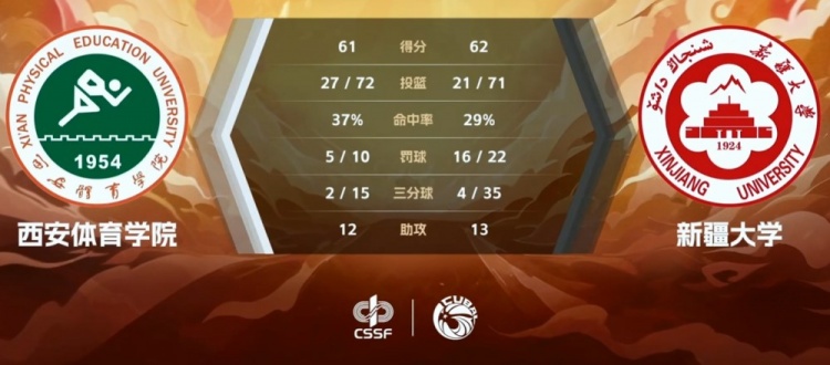 末节新疆大学表现糟糕各种失误和打铁;西安体院开局4分钟里仅得2分也浪费了很多机会,不过节中程勃轩和赵子超的连续拿分帮助他们扳平比分。最后决胜时刻,又是程勃轩在弧顶命中三分帮助西安体院拿到久违的领先;马浩楠造成三分犯规三罚全中帮助新疆大学扳平比分,随后江萨亚补篮得手夺回领先。读秒阶段陈百川的进球一度为西安体院再夺领先,但艾则麦提江最后篮下接住队友传球直接补篮上演绝杀。最终,新疆大学62-61力克西安体育学院拿下比赛。