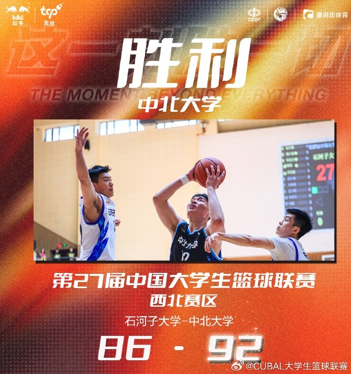 末节开局中北大学进攻端依旧保持稳定输出,李子超一内一外拿下5分巩固10分左右的领先;石河子大学同样保持不错进攻奈何防守端限制不住对手,双方势均力敌分差一直维持在10分出头。不过后半段中北大学后程乏力的问题又出现了,石河子大学依靠着阿克力连续拿分追至3分重燃希望,不过刘翔龙最后时刻站出来连拿4分重新拉开比分守住胜利。最终,中北大学92-86力克石河子大学夺得西北赛区第七名。