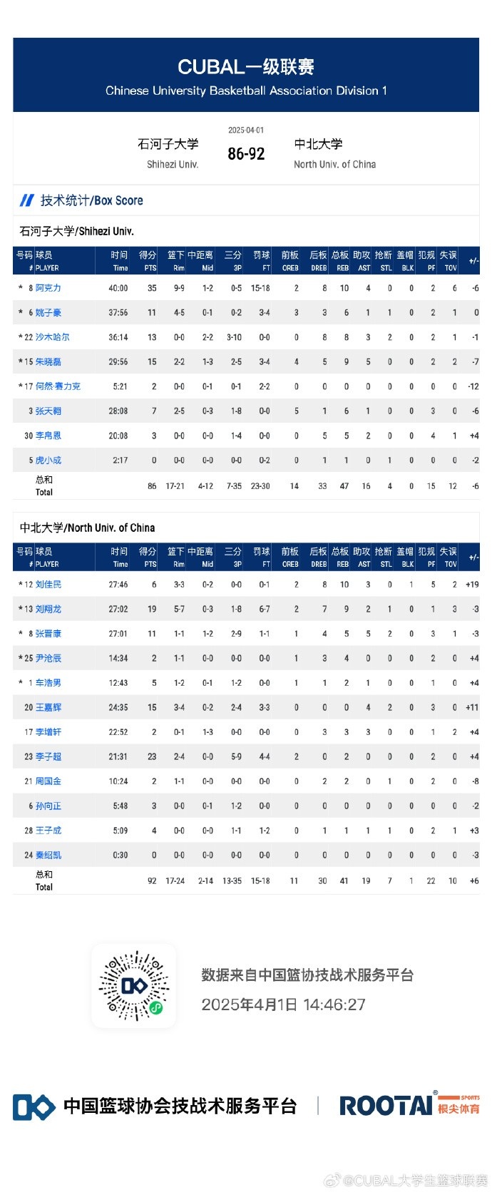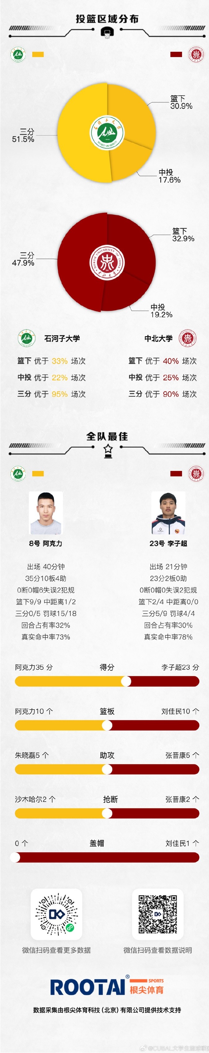 石河子大学:阿克力35分10篮板4助攻、沙木哈尔13分8篮板3助攻2抢断、姚子豪11分6篮板、朱晓磊15分9篮板5助攻、张天翱7分6篮板、李帛恩3分5篮板。