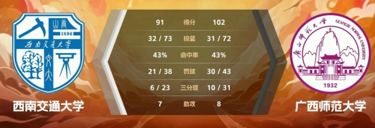 次节回来,广西师大迅速完成反超,不过他们也没有获得拉开分差的机会,西南交大紧咬比分与对手保持拉锯,本节的最后一个进球依旧来自戴俊宇,半场战罢,广西师大49-43反超西南交大。