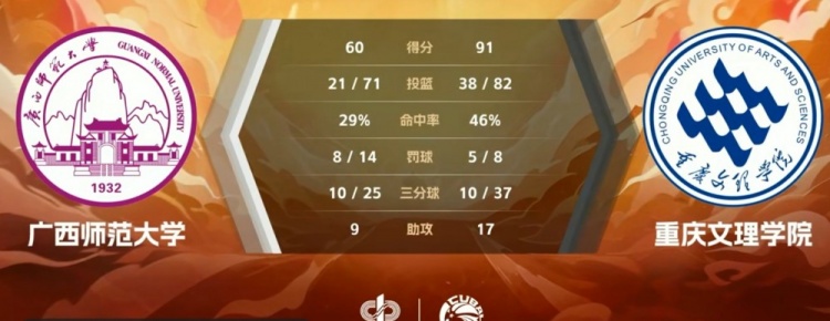 第四节,史磊先中一球,广西师大连续打铁失误,整整半节的时间颗粒无收,重庆文理趁势完成10-0的攻击波继续拉大分差,屈洪辉罚球艰难破荒,史磊三分锦上添花,双方耗完剩余时间。最终,重庆文理91-60大胜广西师大。