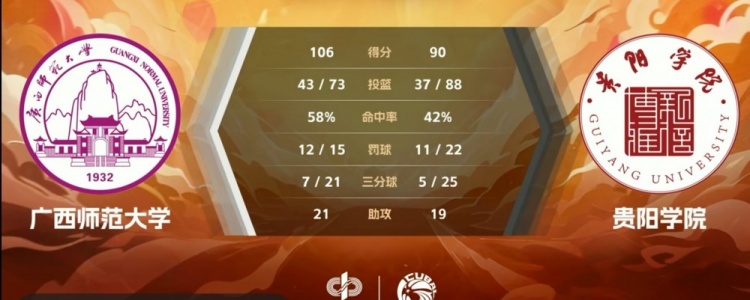 第四节,何钊金内外开花连得6分率队打出10-2的攻击波确立两位数优势,贵阳学院不断冲击篮筐苦苦追赶,黄烨反击打成2+1,个人连续拿分继续扩大优势,贵阳学院后劲不足。最终,广西师大106-90击败贵阳学院。