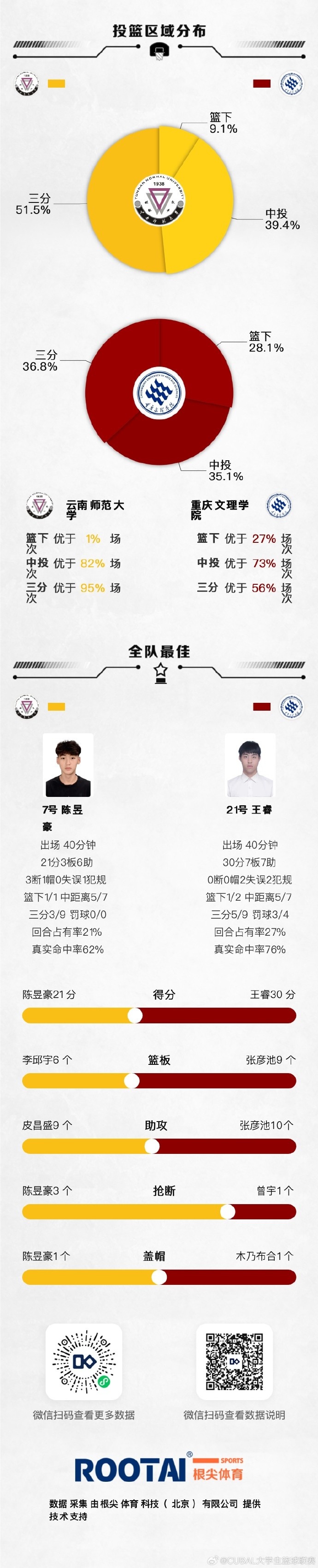 重庆文理学院:王睿30分7篮板7助攻、曾宇24分3篮板4助攻、张彦池12分9篮板10助攻、杨伟斌16分8篮板、木乃布合6分3篮板、史磊2分2助攻。