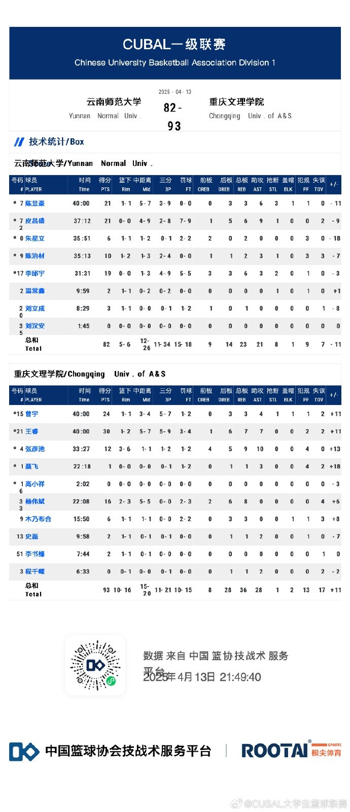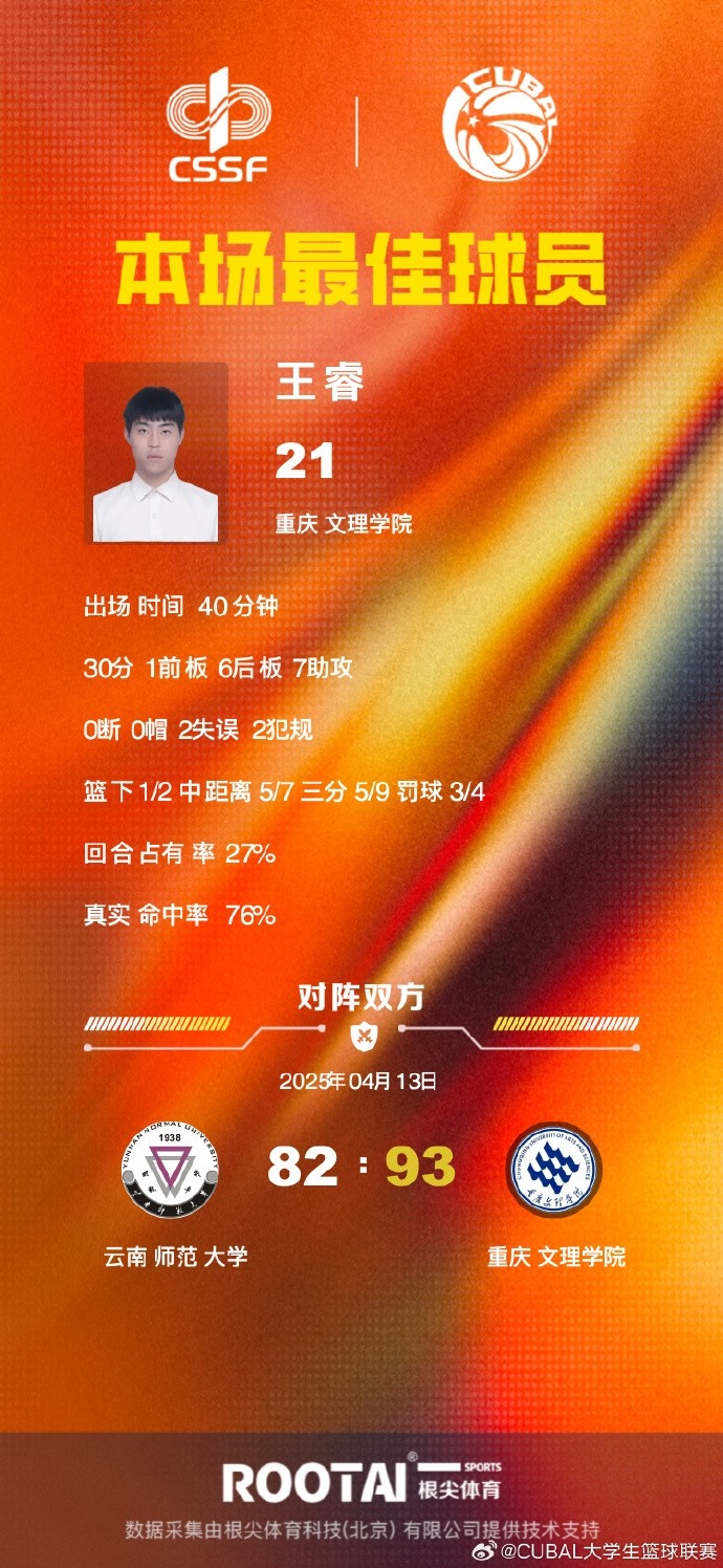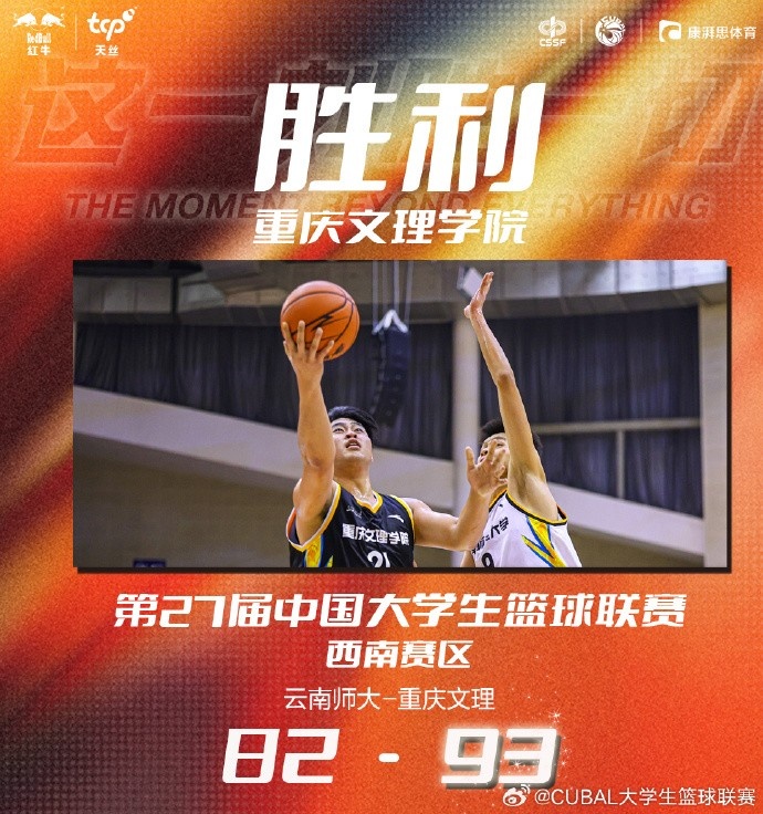 末节之争王睿的三分帮助重庆文理再次拉开两位数分差,但云南师大也在随后依靠皮昌盛的三分和三次罚球迅速追上比分。随后拉锯云南师大又出现间歇性的哑火,重庆文理这边给王睿和曾宇势不可挡连续拿分送出9-0的攻势拉开两位数分差奠定胜局。最终,重庆文理学院93-82击败云南师范大学杀入八强赛。