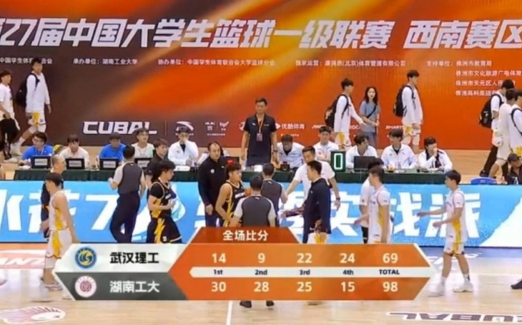 最后一节,武汉理工延续不错的手感追回一些分数,但无奈此前分差过大,湖南工大依旧手握巨大优势。全场比赛结束,湖南工业大学98-69大胜武汉理工大学。