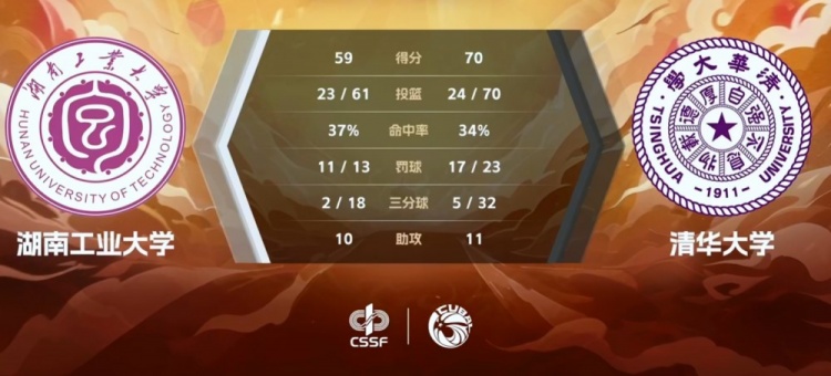 末节开局清华大学凭借刘庆闻的连续拿分送出7-2的攻势继续扩大优势,而湖南工大依旧是吴子煜连续拿分帮助球队在最多落后16分的情况下再次追了上来。有余比赛是两回合比赛,因此两队都想要尝试继续扩大或缩小分差为第二回合做准备,而林俊浩的进球再度迫近个位数让湖南工大看到希望;不过清华大学还是杨曦皓的关键拿分及时稳住局面。最终,清华大学客场首回合70-59击败湖南工业大学拔得头筹。