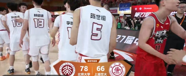 末节决战,北大占得先机,昂萨尔连中三分率队将分差拉开到15分,胡汇三分续命,李苑鑫延续火力,连投带罚帮助球队继续扩大优势,吴泽昊三分艰难止血,此后双方均陷入得分荒,上海交大苦苦追赶无奈此前落后太多。最终,北大78-66击败上海交大,率先挺进决赛。