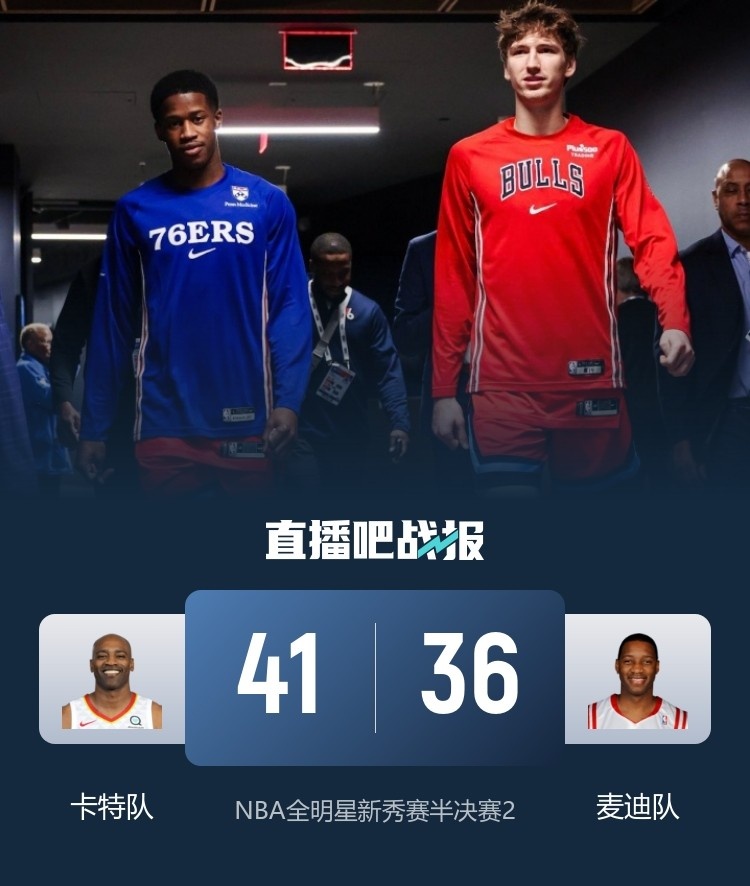 2月14日讯 NBA全明星新秀赛半决赛,麦迪队对阵卡特队。本场比赛先得到40分的球队赢,没有时间限制。科沃德和阿杰伊·米切尔缺席,卡特·布莱恩特和里萨谢分别递补。
