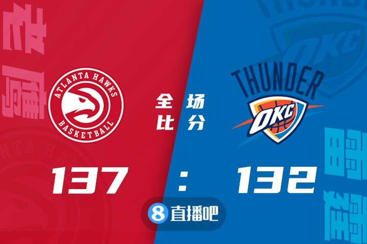 1月26日讯 NBA常规赛继续进行,雷霆主场迎战老鹰,雷霆目前23胜24负排在西部第11位,老鹰则是24胜24负排名东部第8。双方上半场比赛主打对攻战,老鹰多点开花,上半场首发五虎得分全部上双,特雷-杨连续造杀伤要到罚球更是半场就拿到22分,而雷霆则是亚历山大撑起进攻半场暴砍26分,同时替补席也是全民皆兵都有得分贡献,双方半场难分伯仲打成77平。下半场。特雷-杨进攻端继续得分助攻两手抓,替补也有贡献,亚历山大也是能回应,但老鹰末节上来就一波8-0小高潮一举确立双位数领先,随后老鹰牢牢保持住两球以上领先优势,最后基迪连续上篮追分,吹杨关键失误后杰伦-威廉姆斯反击扣篮追到差1分,科林斯两罚全中后亚历山大杰伦上篮不中,最终老鹰137-132险胜雷霆。