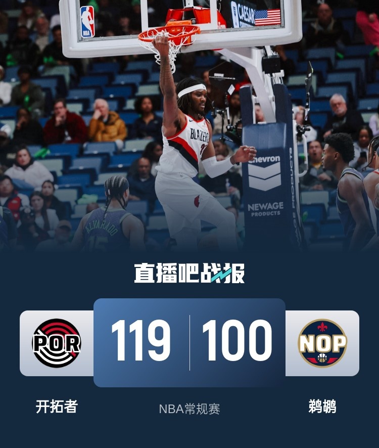 开拓者(13-23):阿夫迪亚26分6篮板,卡马拉15分5助攻3断,艾顿11分13篮板,夏普21分2助攻,西蒙斯17分6篮板,亨德森13分5助攻,穆雷6分,罗威4分6篮板4帽,班顿4分2断。
