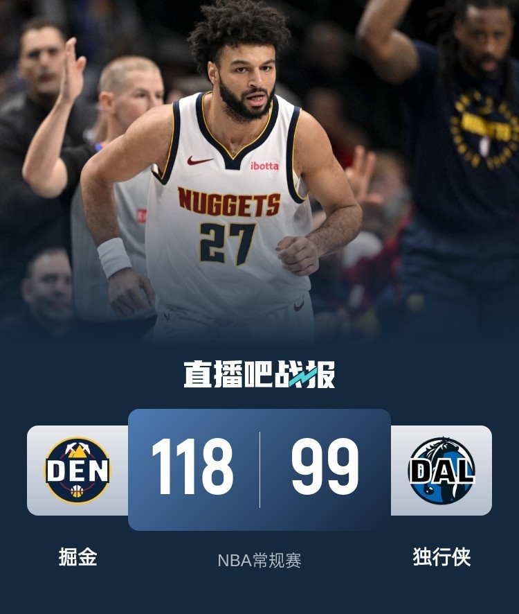 比赛上来,两队短暂拉锯后穆雷突然爆发,他个人连中三记三分球帮助掘金建立起两位数的领先优势,整个第一节穆雷独得19分仅比独行侠全队少2分,次节的情况与首节相似,穆雷继续着自己无解的表现,半场轰下32分,独行侠两节过后已经落后了26分;下半场回来,掘金的命中率出现大幅度下滑,不过独行侠依旧没能把握住追分的机会,他们单节也只拿到22分,比赛在末节早已失去悬念,最终掘金大胜独行侠迎来四连胜。