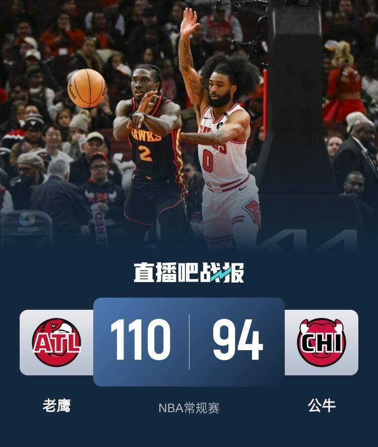 比赛上来,残阵老鹰就率先进入状态连拿六分取得领先,公牛此后虽然有追平比分的表现但始终无法完成反超,次节老鹰的进攻更加犀利,一波15-0的攻势直接拉开分差,顶替特雷-杨首发的双向球员基顿-华莱士半场砍下18分4板4助3断的数据,半场结束时公牛落后14分;下半场回来,公牛虽然有追分的势头但被老鹰及时遏制住,分差此后一直保持在十分左右,公牛在末节也没有任何机会,最终老鹰力克公牛,迎来连胜的同时也送给后者三连败。