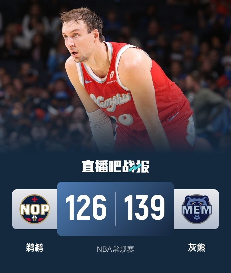 上半场,灰熊率先发力,多点开花打出16-7的开局,鹈鹕不断冲击内线连投带罚迫近比分,次节鹈鹕火力全开,里突外投连续拿分强势反超,灰熊努力追赶,半场战罢鹈鹕71-62领先灰熊。下半场,灰熊大举反击,贝恩单节独得14分带队完成反超,末节灰熊稳扎稳打保持优势,最终,灰熊139-126击退鹈鹕。