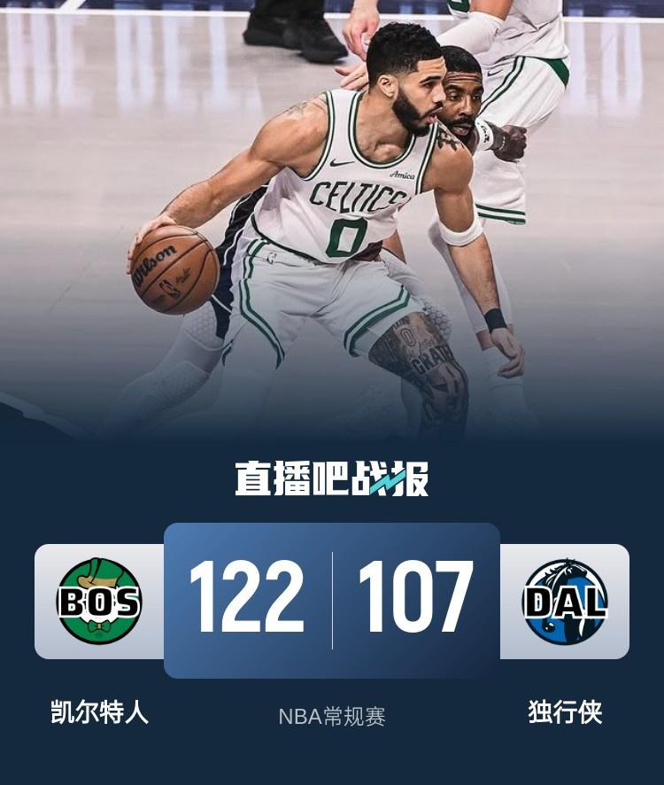 比赛开始,独行侠捍卫主场打出13-4不错开局,但双探花联手里突外投带队追分并一度反超,欧文中投止血,首节独行侠领先4分,次节独行侠进攻端突然断电,凯尔特人外线接连三分命中顺势打出16-4攻击波反超比分,随后绿军扩大领先,加福德压哨补篮2+1追到差10分。下半场,欧文带队缩至个位数分差,但绿军发力回应12-2攻击波稳住领先,随后绿军接连4记三分直接拉开20分以上领先,末节哈迪里突外投连砍7分,独行侠打出小高潮迅速追分,但绿军能回应保持住十几分领先,最终凯尔特人122-107力克独行侠。