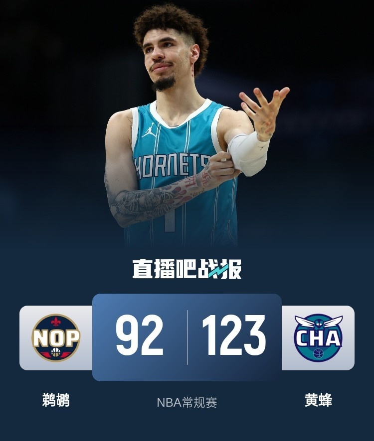 开场后布里奇斯和鲍尔上来轮番拿分,鹈鹕内外开花也是打得相当顺畅,鹈鹕外线连中三分保持微弱领先,不过黄蜂在第一节结束前回应一波三分雨将比分反超。第二节上来黄蜂延续不错的手感迅速将分差拉大到两位数,鹈鹕进攻端打得比较艰难,麦科勒姆手感不佳,主要靠锡安强攻。易边再战,两队打得都比较混乱,黄蜂多点开花在三节结束时将分差拉大到25分,第三节锡安在内线没有太多表现。第四节锡安回来连续追分,不过鹈鹕防守完全无法限制黄蜂,场上分差依旧是20分以上,最终黄蜂123-92大胜鹈鹕结束2连败,鹈鹕遭遇2连败。