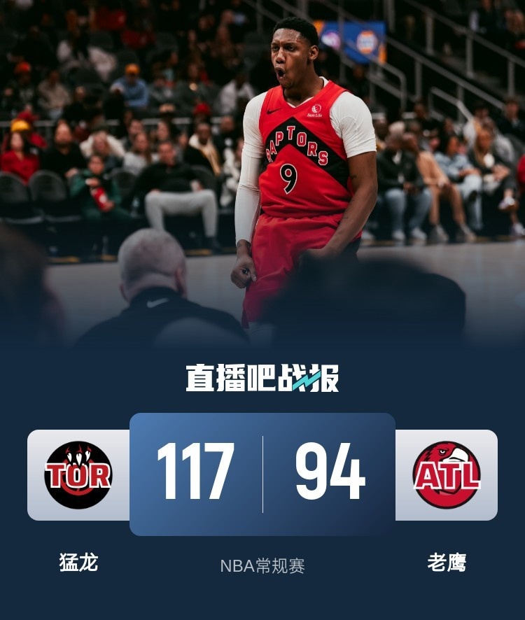 比赛开始后老鹰多点开花率先打出攻势,奥孔武表现活跃接连拿分,老鹰一度领先到12分,随后巴恩斯站出来为猛龙缩小分差。第二节猛龙连续打出反击将比分反超,老鹰虽然努力追分,但巴雷特和巴恩斯总能及时回应,半场过后,猛龙反超老鹰7分。下半场回来,猛龙在巴恩斯和巴雷特的带领下依旧打得有声有色,特雷-杨手感不佳,老鹰的轮换阵容进攻表现也不行,反倒是布歇替补表现相当神勇,猛龙继续巩固领先优势。最后一节老鹰依旧失误较多未能掀起有效反扑,猛龙将分差拉大到20分以上,比赛失去悬念,最终猛龙117-94大胜老鹰取得3连胜,老鹰遭遇4连败。