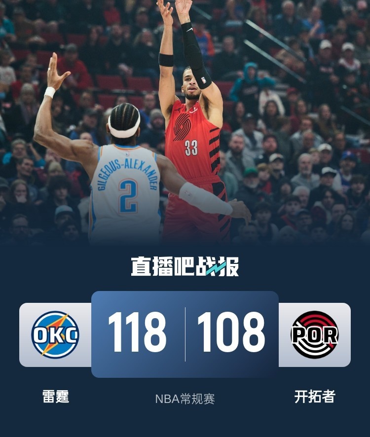 雷霆(37-8):亚历山大35分5板1助3断、杰伦-威廉姆斯24分5板8助2帽、乔16分4板1助、哈尔滕施泰因14分11板6助、杰林-威廉姆斯6分7板2助、肯里奇-威廉姆斯6分3板、华莱士5分2板3助、吉昂5分1板1助、阿隆-维金斯4分1板、卡鲁索3分4板2助