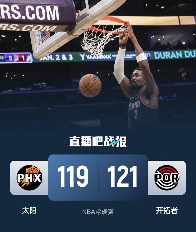 开拓者(21-29):艾顿25分20板2助、阿夫迪亚24分8板5助、卡马拉17分5板1助、亨德森15分2板6助、格兰特14分5板4助、安芬尼-西蒙斯13分2板10助2断、夏普9分1板2助、克林根4分5板