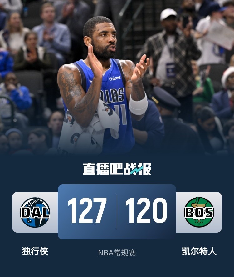 独行侠(27-25):克莱25分3板4助、丁威迪22分2板2助、马绍尔20分2板3助、欧文19分3板4助4断、克里斯蒂15分6板4助、埃克萨姆15分5助、加福德8分15板5助2帽、爱德华兹3分3板3助、普罗斯珀1板2助3断