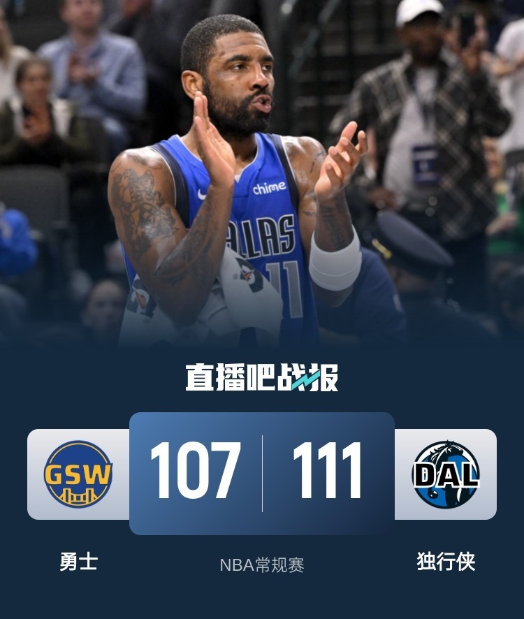 此役一上来双方互相试探,库里连投带传串联全队,但欧文手感滚烫强势回应,克莱外线续上火力,双方你来我往火热对攻,首节结束时独行侠领先1分,次节回来,独行侠延续火力一度确立两位数优势,勇士及时复苏蚕食分差,半场战罢,独行侠依然领先1分。易边再战后欧文予取予求率队再度拉开比分,勇士连中三分短暂止血,三节结束后独行侠保持5分优势,末节决战,勇士回敬13-2小高潮拉回悬念,决胜时刻马绍尔关键抛投打进,欧文制造巴特勒进攻犯规后勇士挑战失败,克里斯蒂两罚全中并上演致命抢断,勇士回天乏术,最终独行侠111-107力克对手。