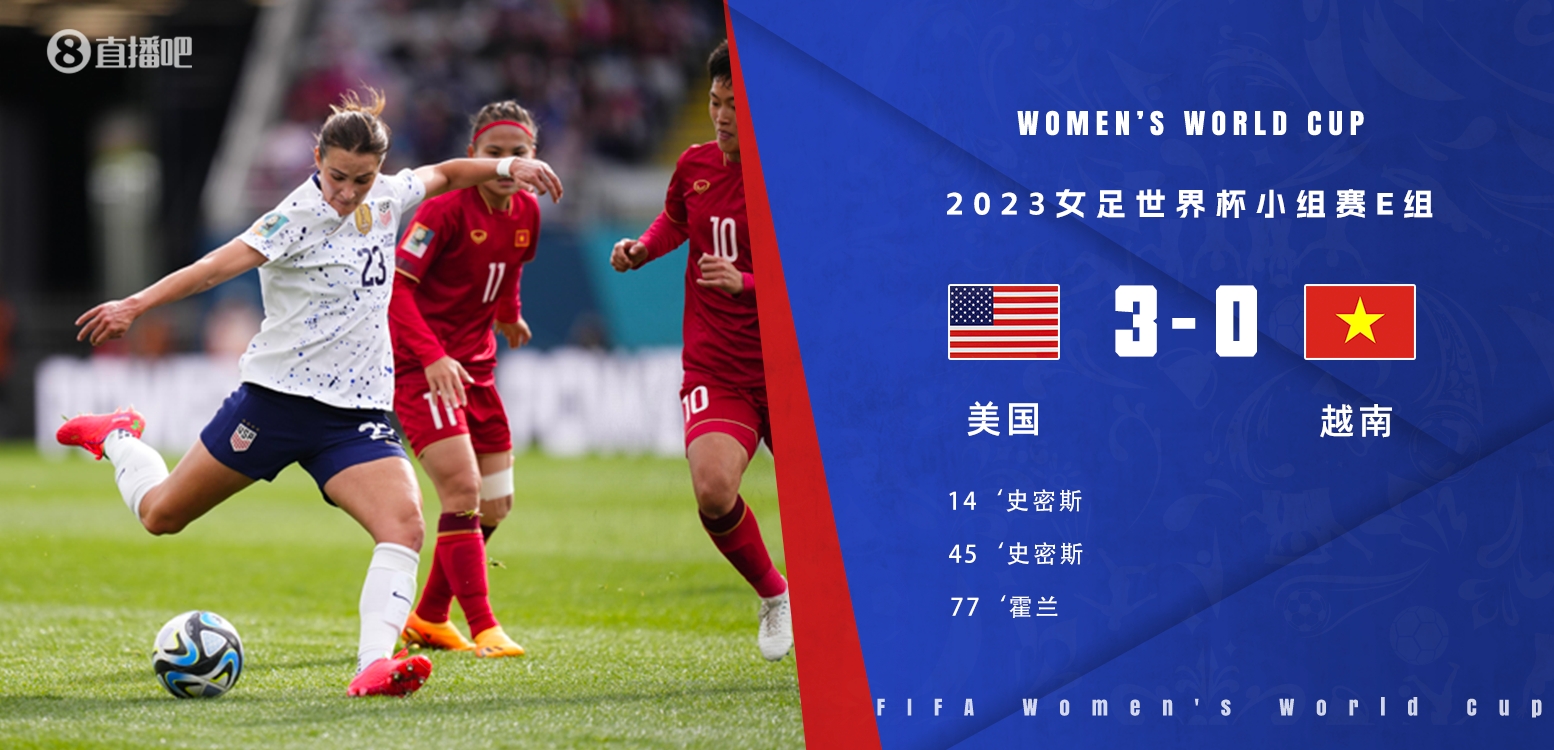 7月22日讯 北京时间7月22日09:00,女足世界杯小组赛E组第一轮美国迎战越南的比赛,上半场摩根助攻索菲娅-史密斯推射首开记录,摩根失点,补时阶段史密斯完成双响,半场结束,美国女足2-0越南女足。下半场史密斯助攻霍兰破门,最终美国女足3-0越南女足取得开门红。