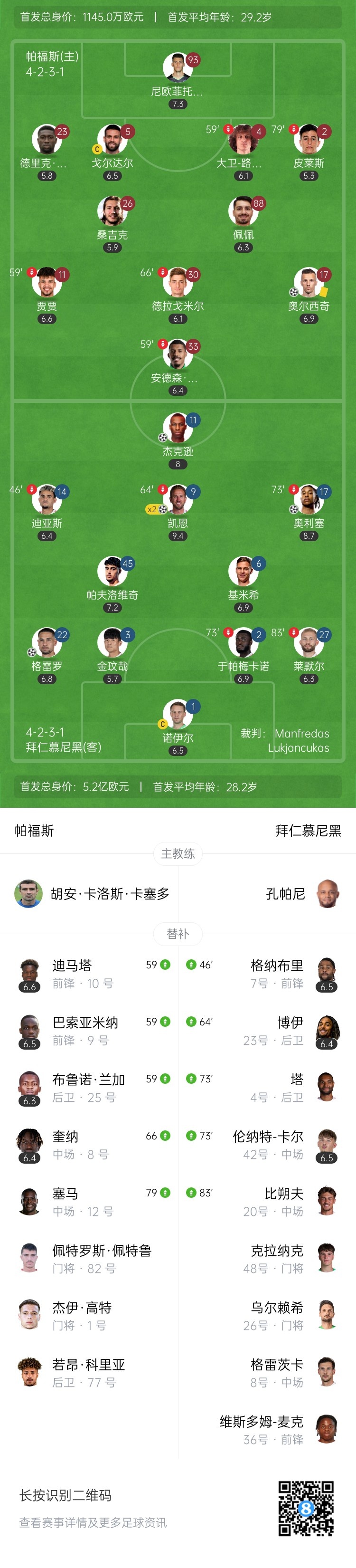 下半场伤停补时3分钟,全场比赛结束,最终拜仁5-1帕福斯。