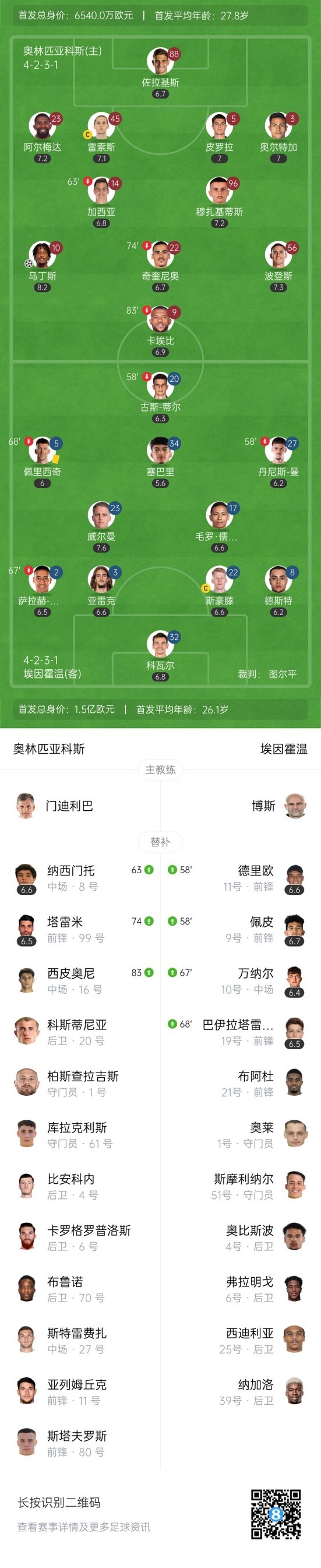 下半场补时4分钟,奥林匹亚科斯1-1埃因霍温。