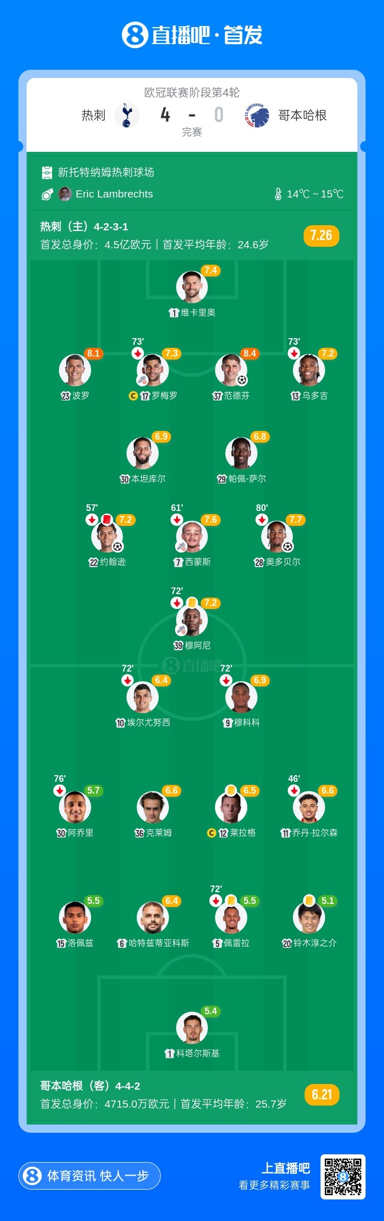 11月5日讯 欧冠联赛阶段第4轮,热刺坐镇主场新托特纳姆热刺球场迎战哥本哈根。上半场,约翰逊先拔头筹。易边再战,奥多贝尔、帕利尼亚破门,范德芬超级一条龙个人秀,约翰逊直红。最终热刺4-0哥本哈根。积分榜方面,热刺8分,哥本哈根1分。