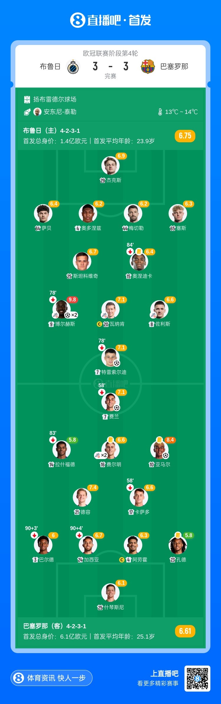 11月6日讯 北京时间11月6日凌晨4:00,欧冠联赛阶段第4轮,布鲁日坐镇扬布雷德尔球场迎战巴塞罗那。上半场特雷索尔迪破门,费兰-托雷斯接费尔明助攻迅速扳平,博尔赫斯进球帮助布鲁日再次将比分超出,巴萨暂1-2布鲁日;下半场费尔明助攻亚马尔扳平,博尔赫斯再次破门,亚马尔造成佐利斯乌龙,最终巴萨3-3布鲁日,无缘连胜。