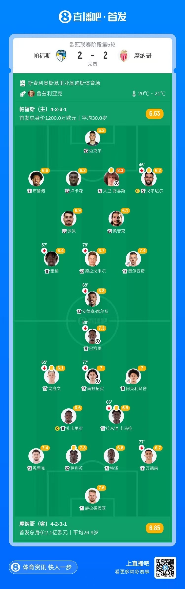 第18分钟,帕福斯右侧角球机会,奥尔西奇主罚开到点球点附近,大卫·路易斯大力头球破门!帕福斯1-1扳平摩纳哥↓