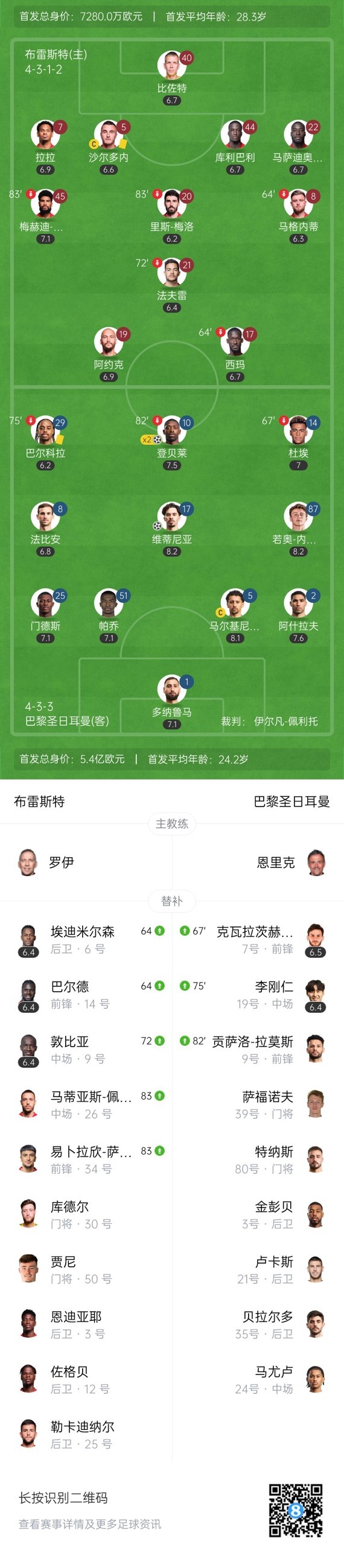 下半场补时5分钟,布雷斯特0-3巴黎。