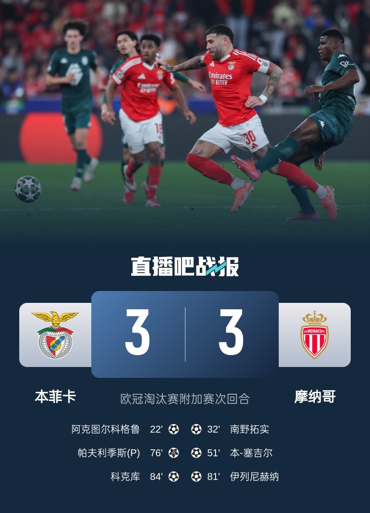 2月19日讯 欧冠淘汰赛附加赛次回合,首回合1-0占得先机的本菲卡坐镇主场光明球场迎战摩纳哥。上半场,阿克图尔克格鲁进球,南野拓实扳回一球。易边再战,本-塞吉尔进球,帕夫利季斯点射建功,伊列尼赫纳破门,科克库再次帮助本菲卡总比分取得领先。最终本菲卡总比分4-3淘汰摩纳哥晋级16强。
