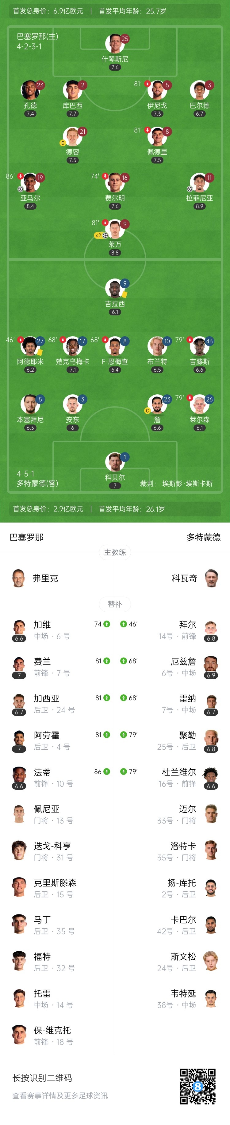 下半场补时3分钟。最终全场比赛结束,巴萨4-0多特。