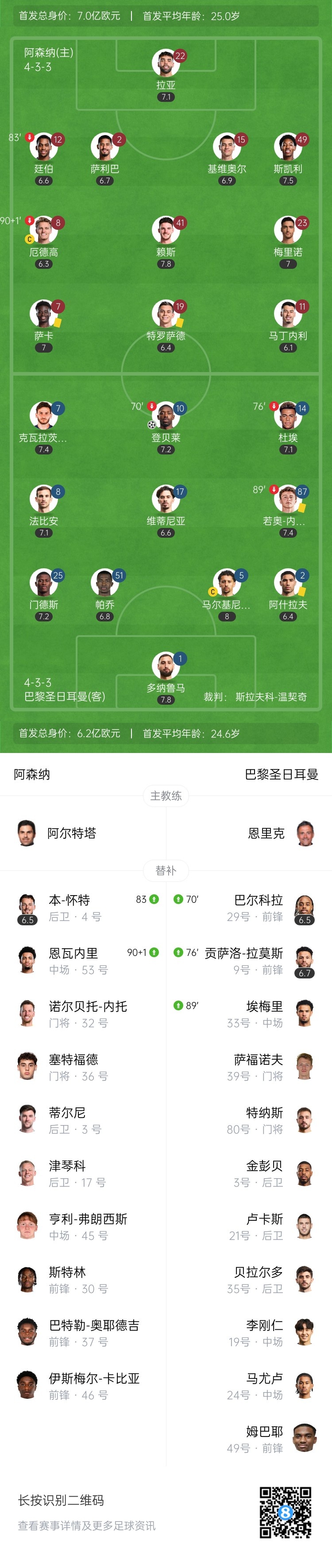 第4分钟,克瓦拉茨赫利亚左路盘带,右脚外脚背分球禁区线附近的登贝莱,后者不停球直接抽射中柱入网,巴黎1-0领先阿森纳↓